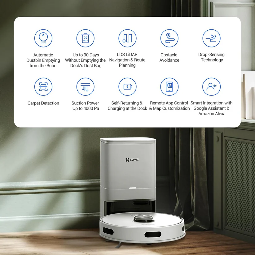 Featuring vacuum & mop design in one device, the RE5 Plus is the go-to option to spare you from tedious, repetitive, and back-aching cleaning routines. It delivers industry-leading 4,000 Pa suction power, large water tank, and smart navigation to thoroughly boost whole-home cleaning. The all-around charging dock automatically collects and seals dust, providing hands-off vacuuming for up to 90 days. Enjoy easy control and personalized cleaning – the most efficient way to clean your home – with the EZVIZ App.
