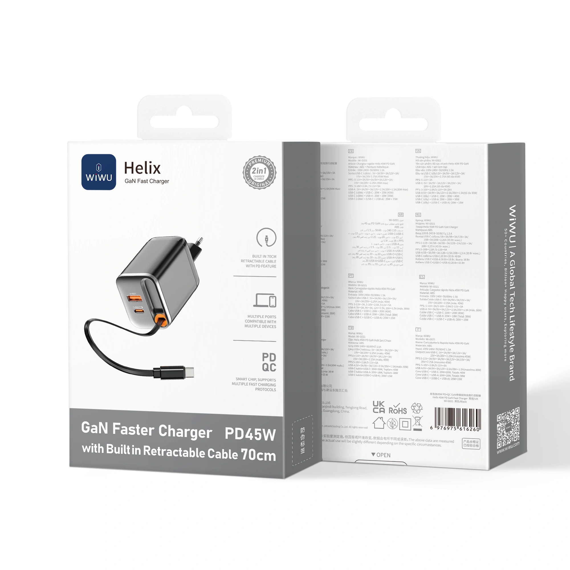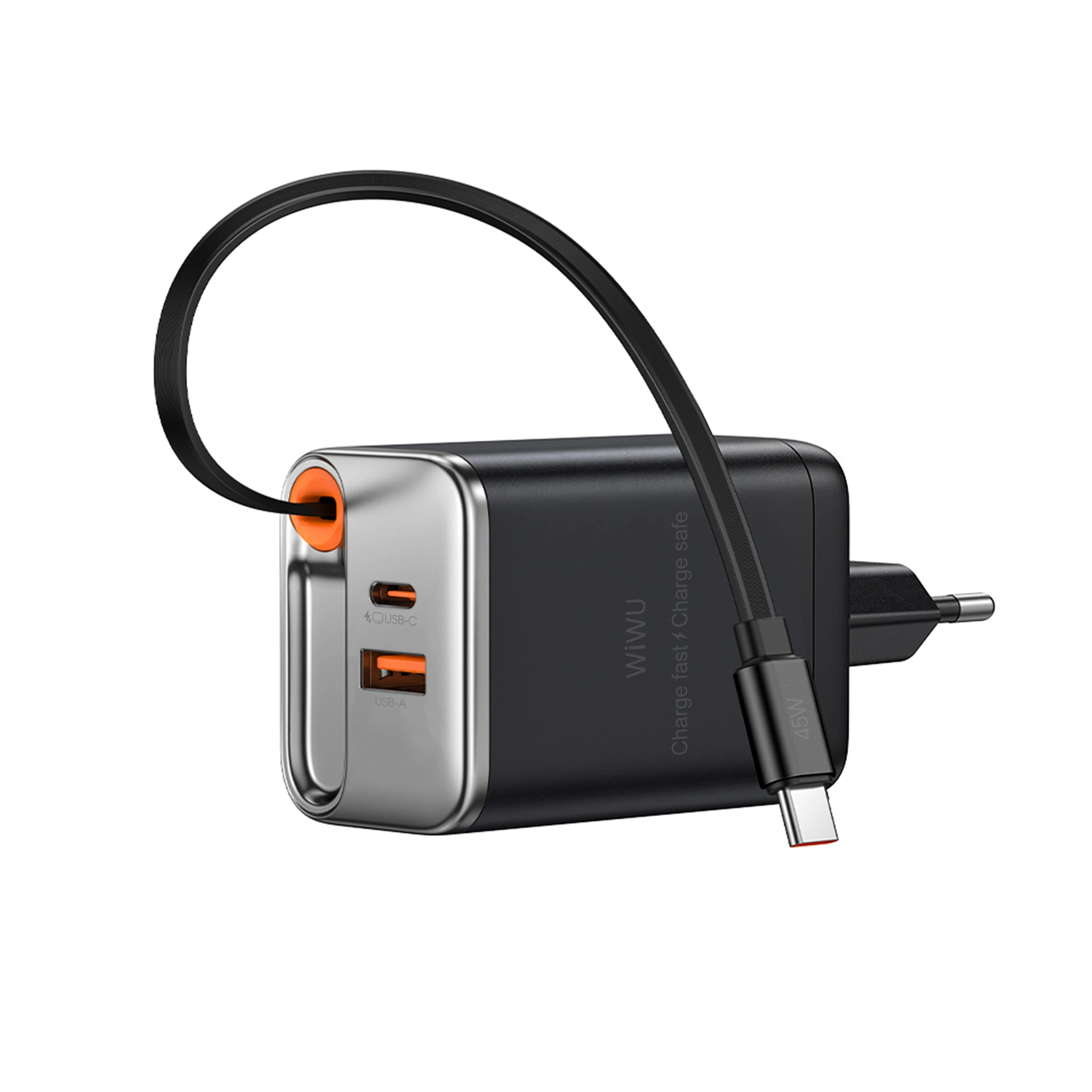 The Wi-G021 is a compact 45W GaN fast charger equipped with dual USB-C ports, a USB-A port, and a built-in 70cm retractable Type-C cable for clutter-free use. It supports multiple fast-charging protocols (PD, PPS, QC) and intelligently adjusts power for simultaneous charging of phones, tablets, and laptops. With magnetic auto-retraction and global voltage support, it’s the perfect travel companion.