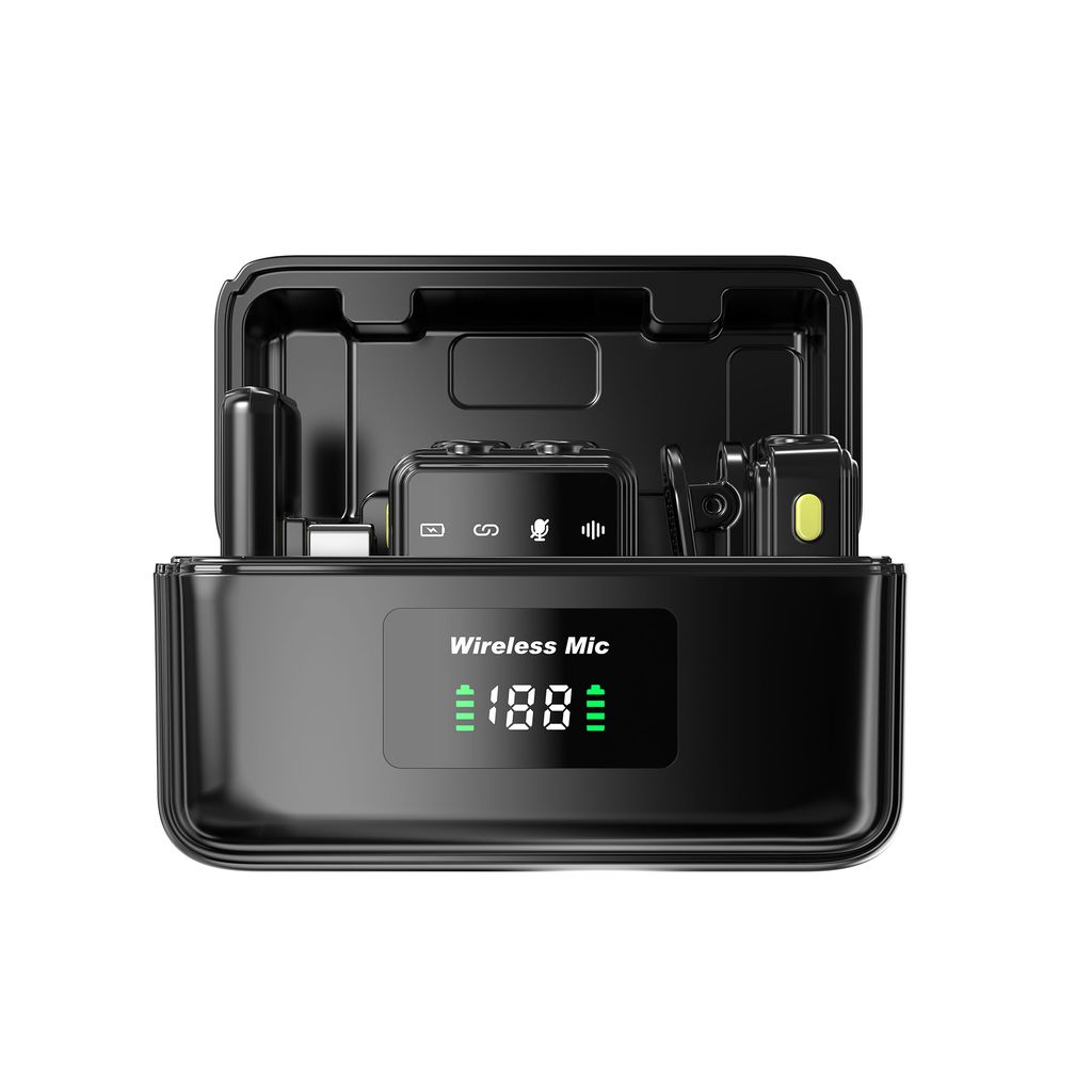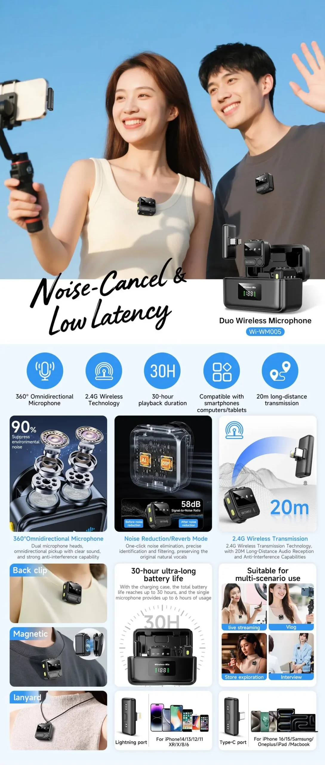 Wi-WM005 is your go-to clip-on Bluetooth microphone with dual receivers (Apple and Type-C), perfect for mobile content creators. JL6976D chip offers Bluetooth 5.3 stable transmission up to 25m. Enjoy 6-hour battery life, built-in noise reduction, and reverb effects for pro-level recordings.